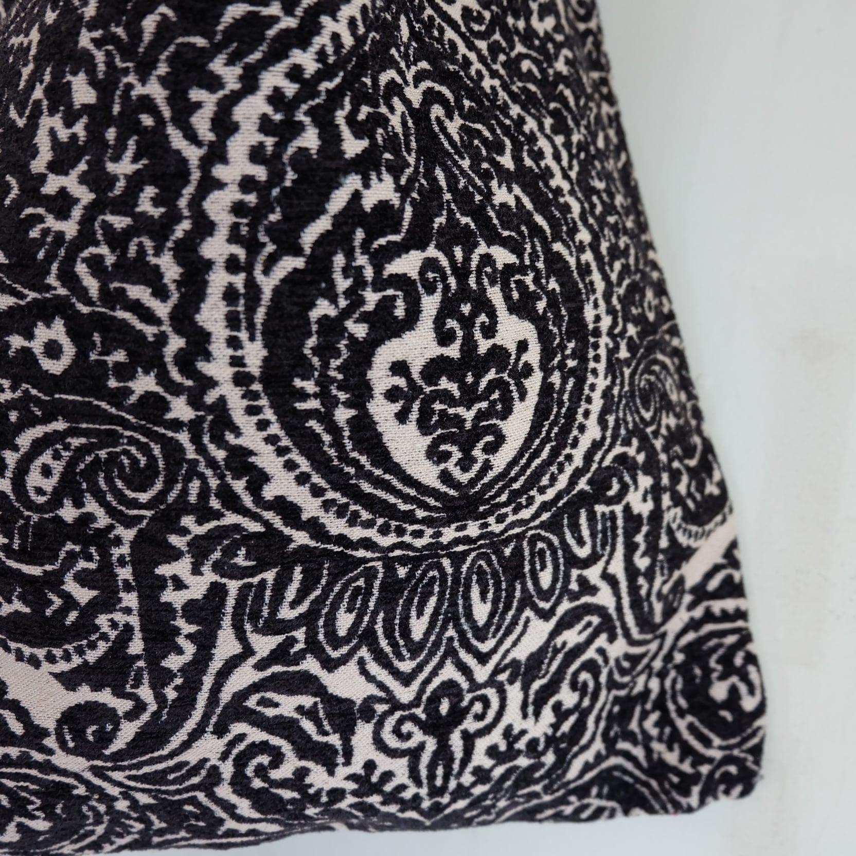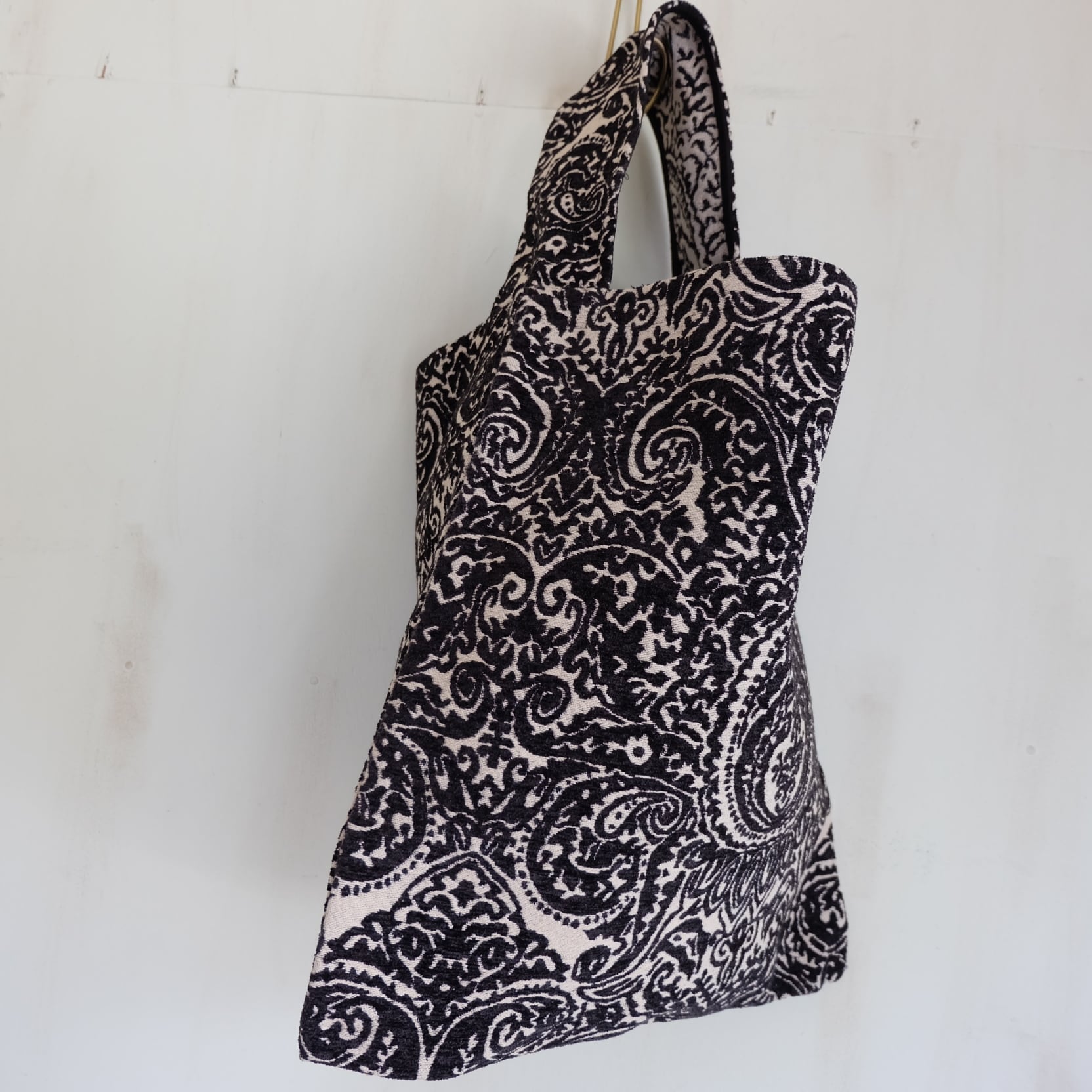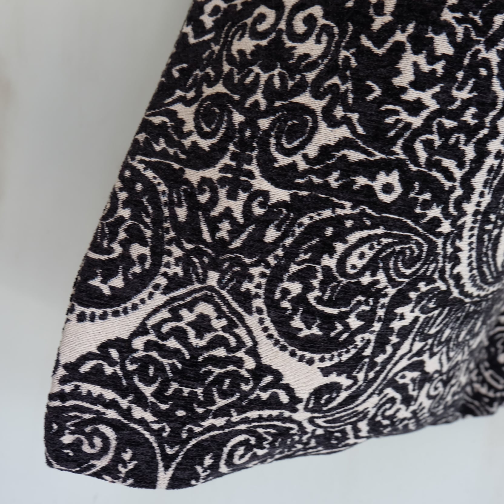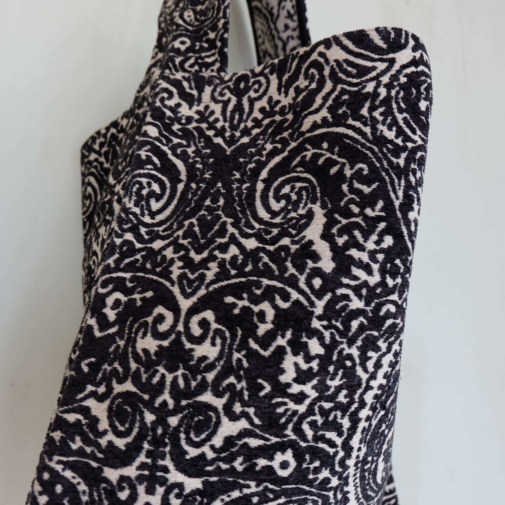 ベージュ系のしっかりしたベースに 黒のモール調素材の柄が印象的です