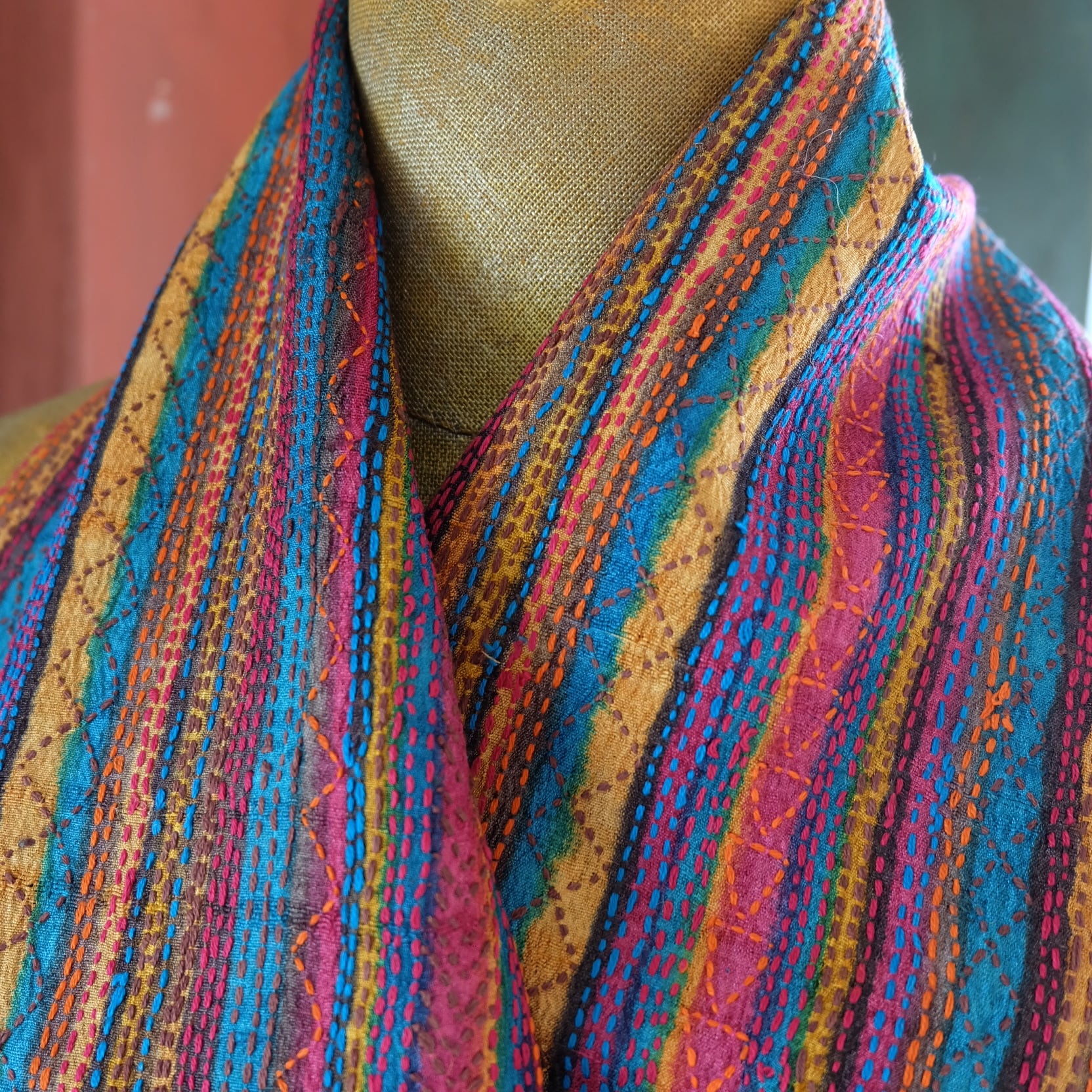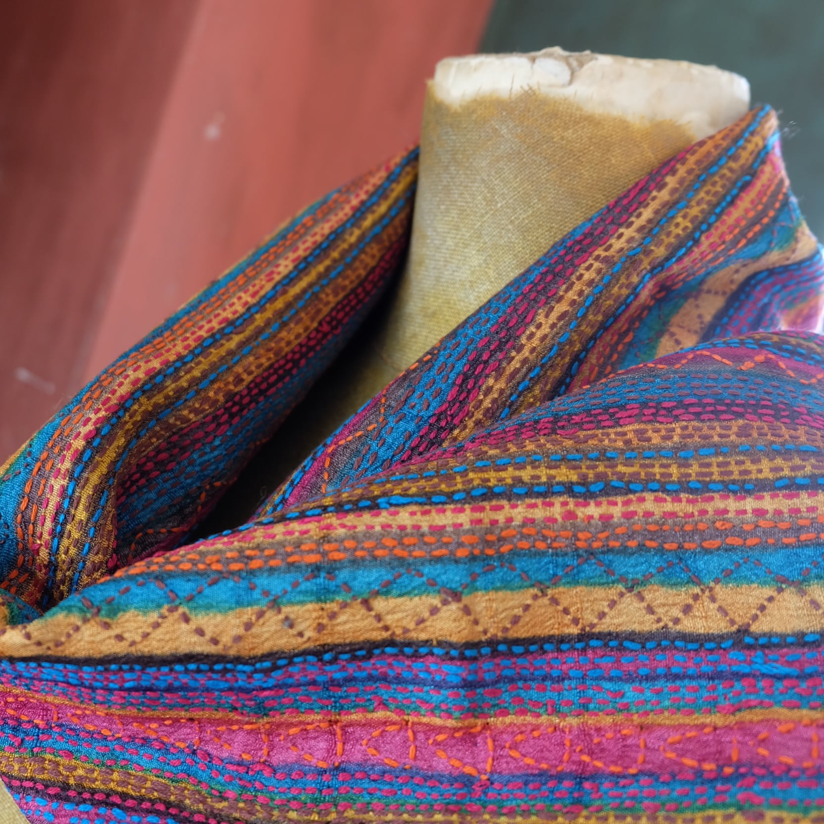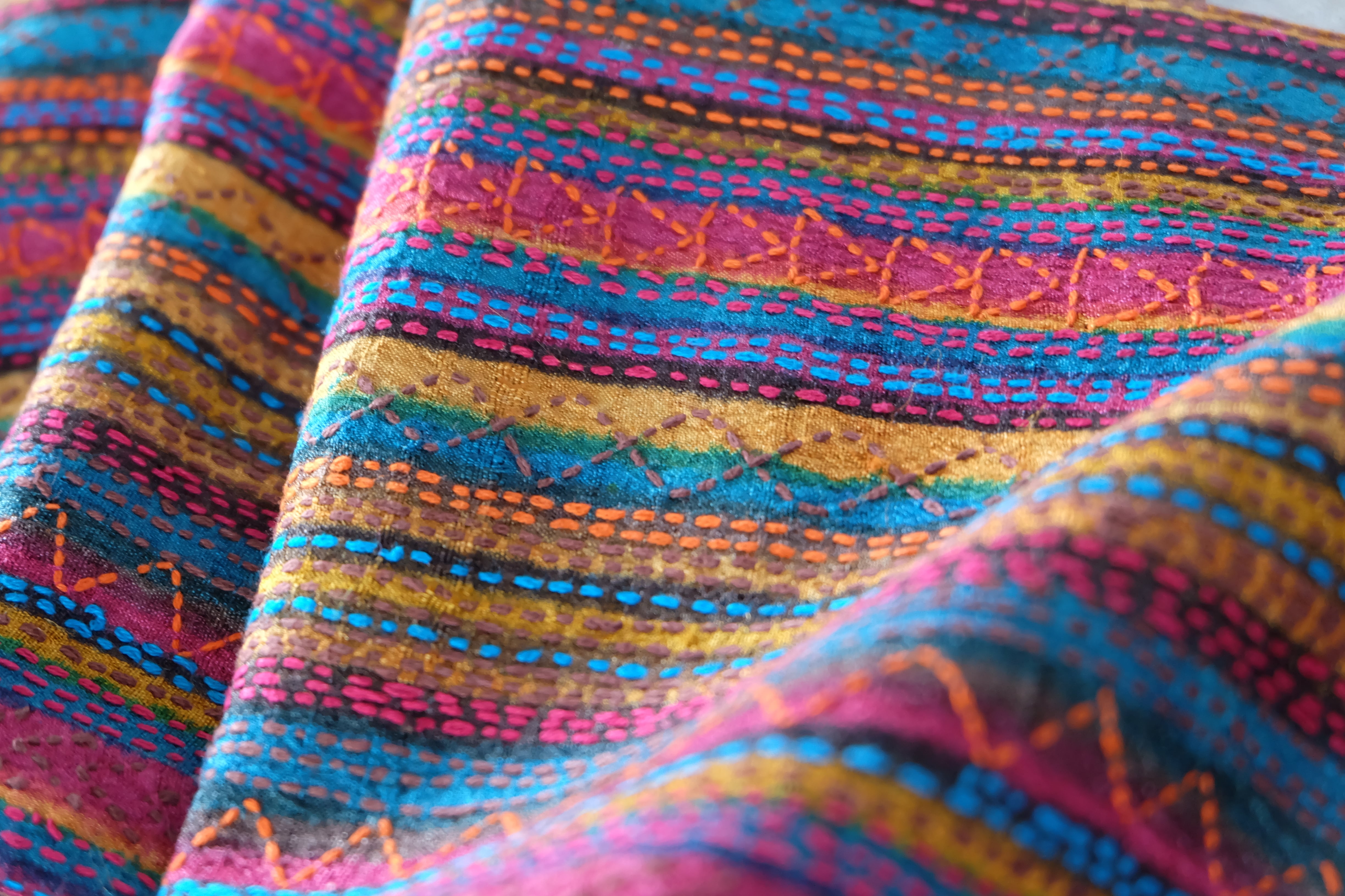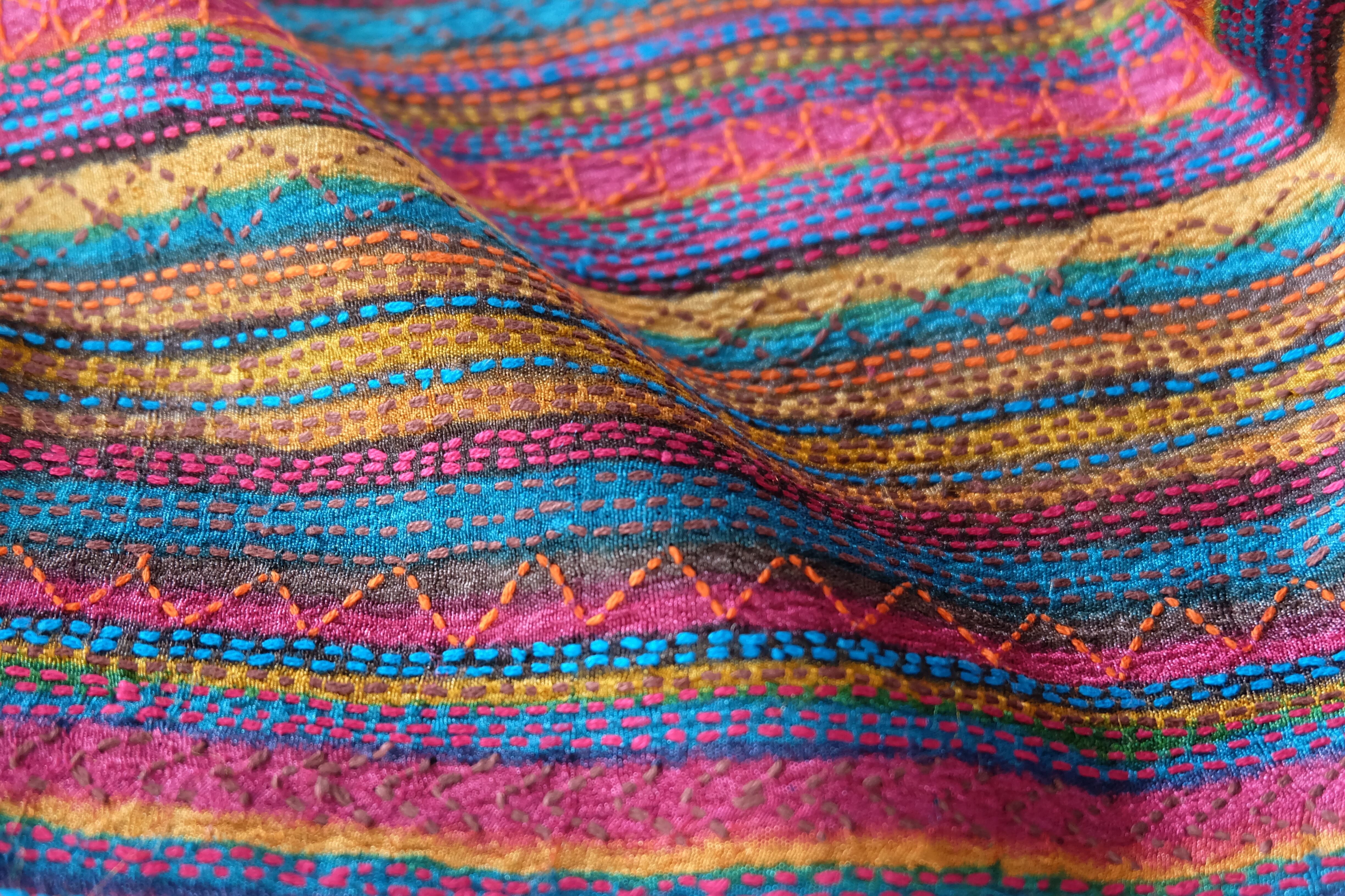 手織りのタッサーシルクに木版プリントをし それに合わせてカンタ(刺し子)を施しています