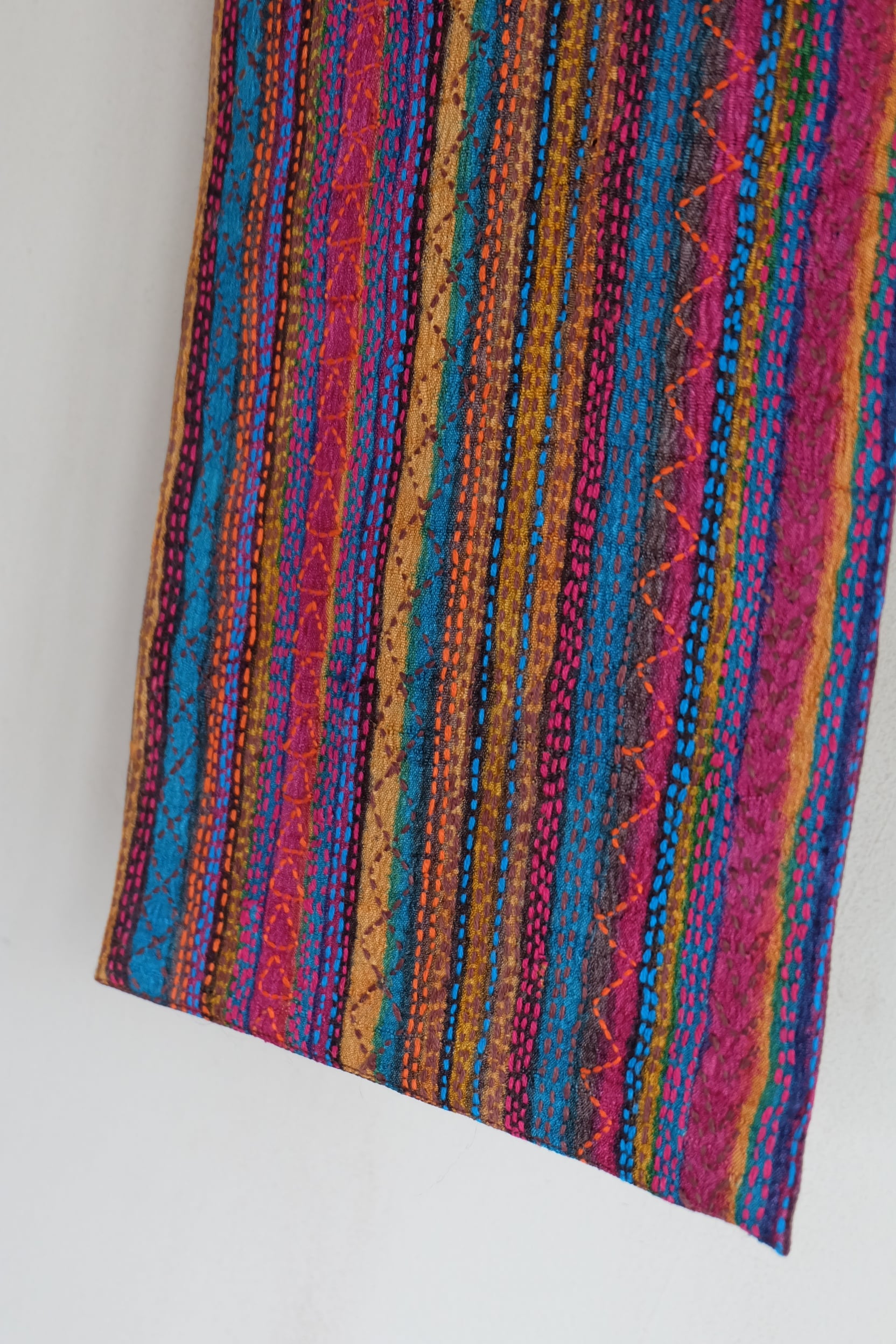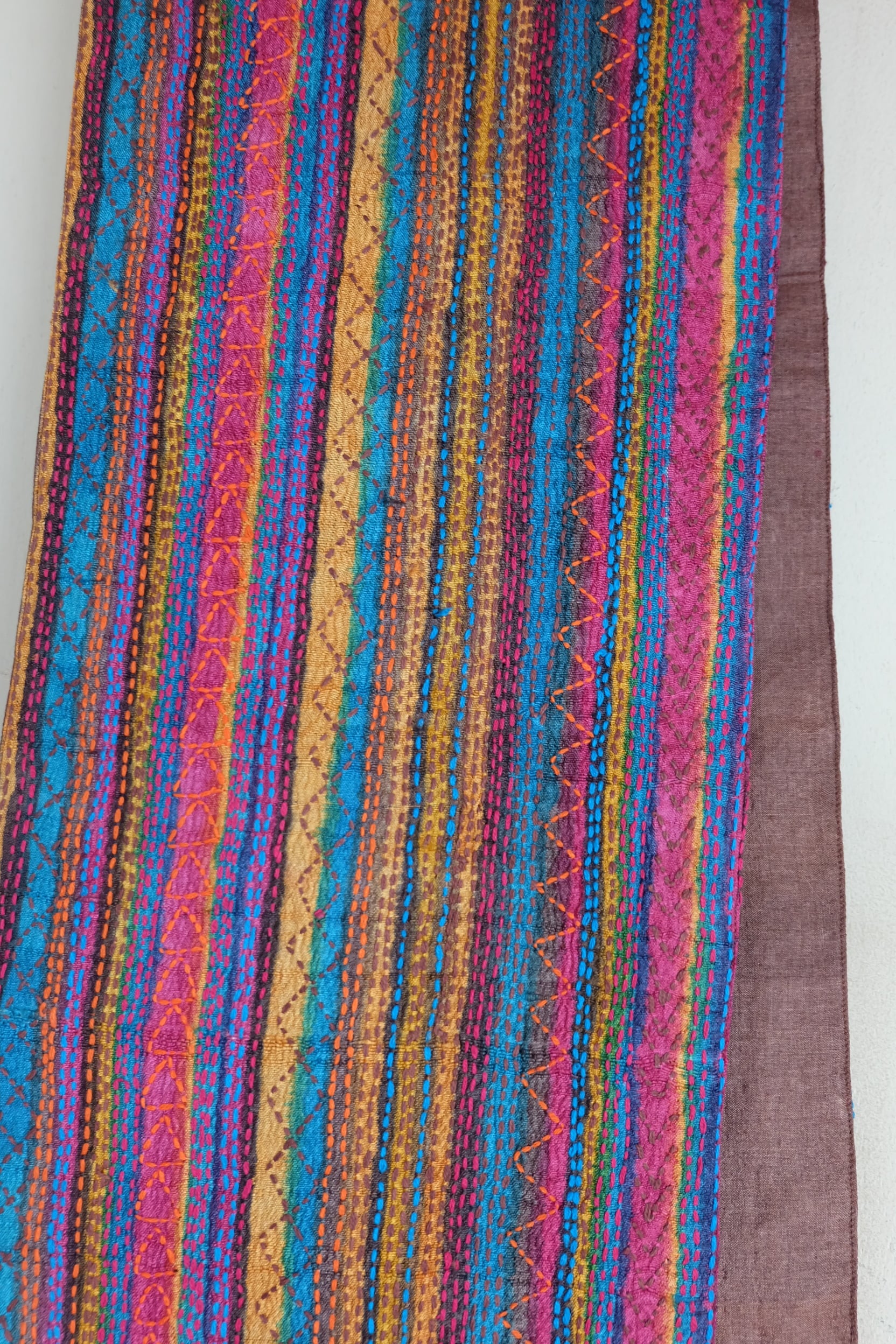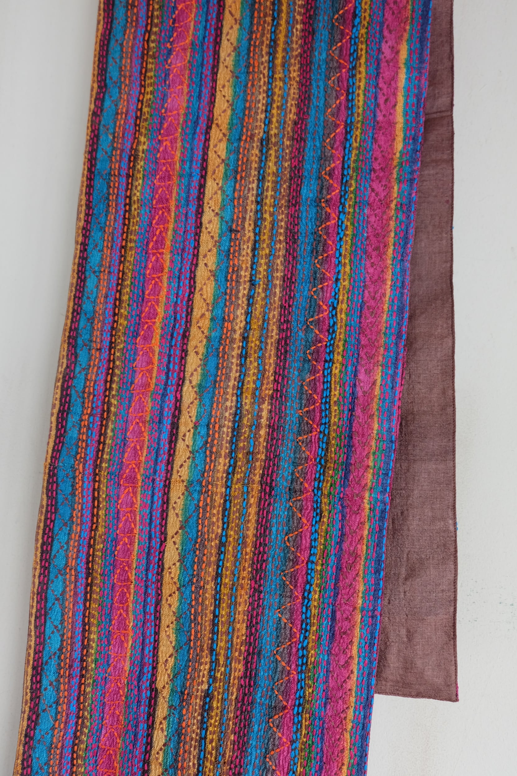 手織りのタッサーシルクに木版プリントをし それに合わせてカンタ(刺し子)を施しています