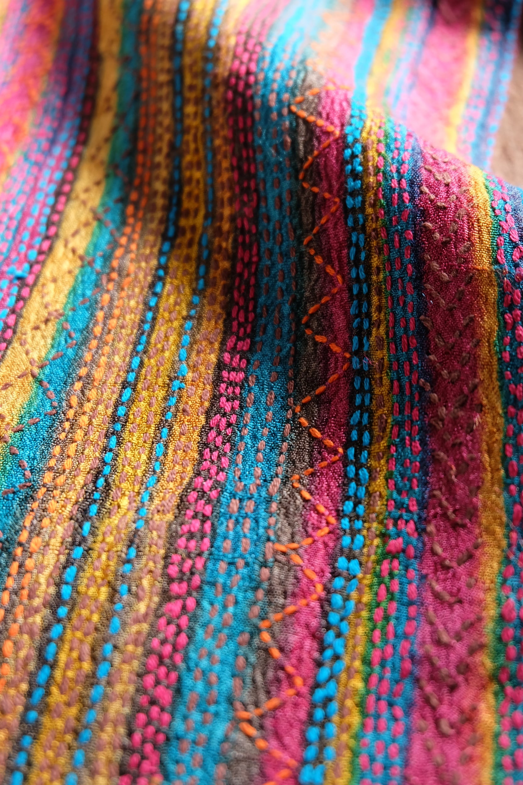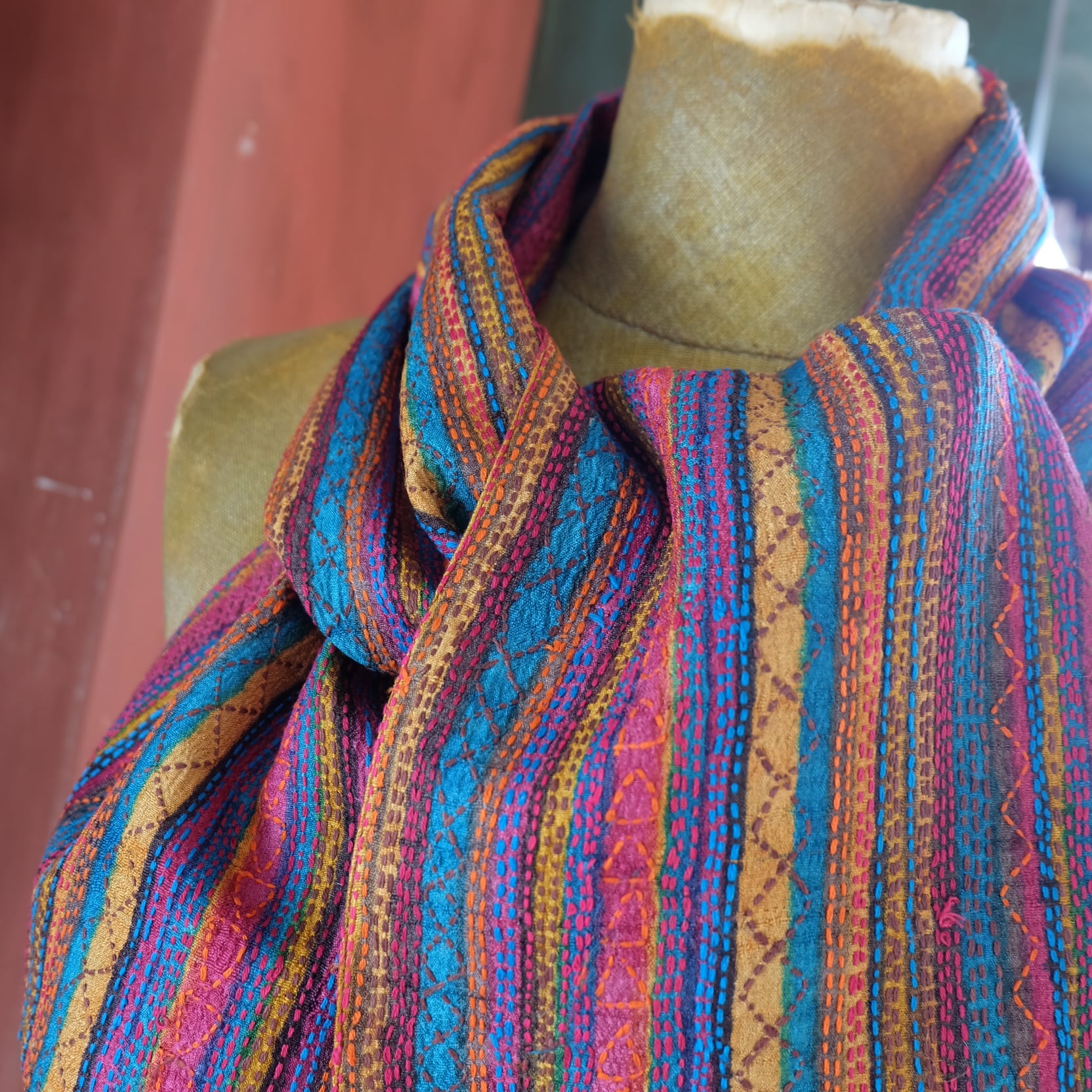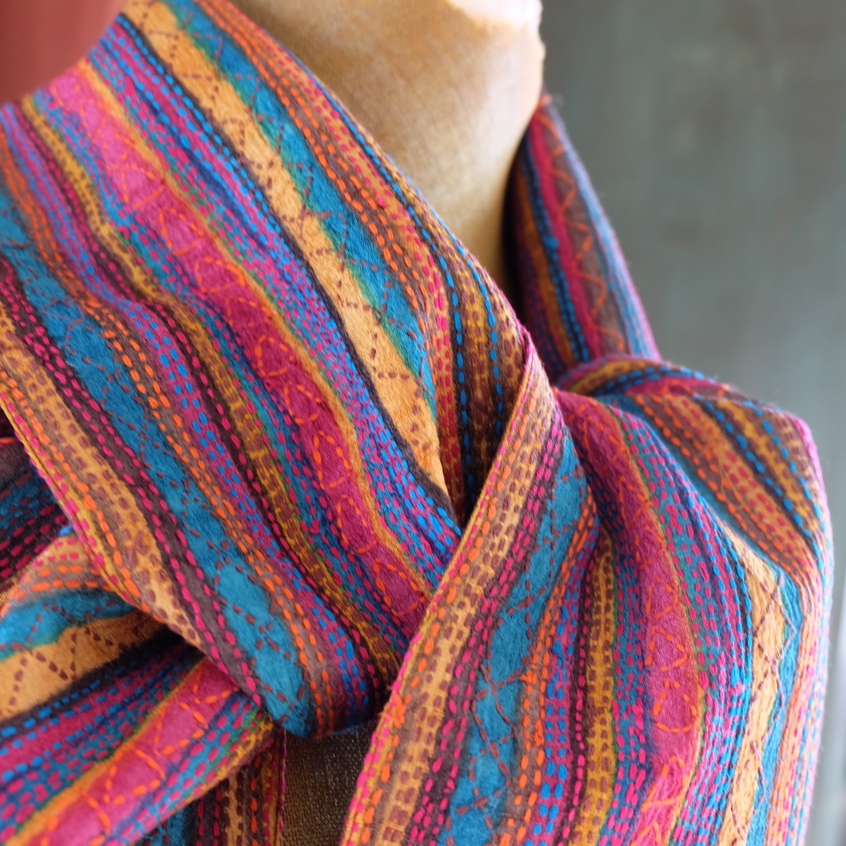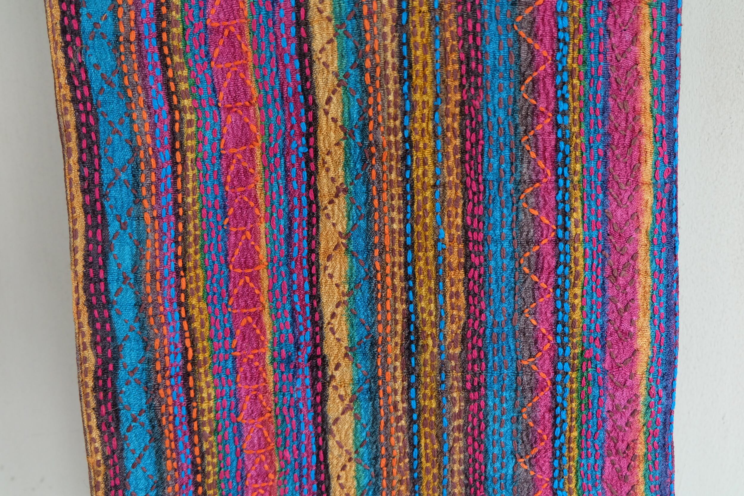 手織りのタッサーシルクに木版プリントをし それに合わせてカンタ(刺し子)を施しています